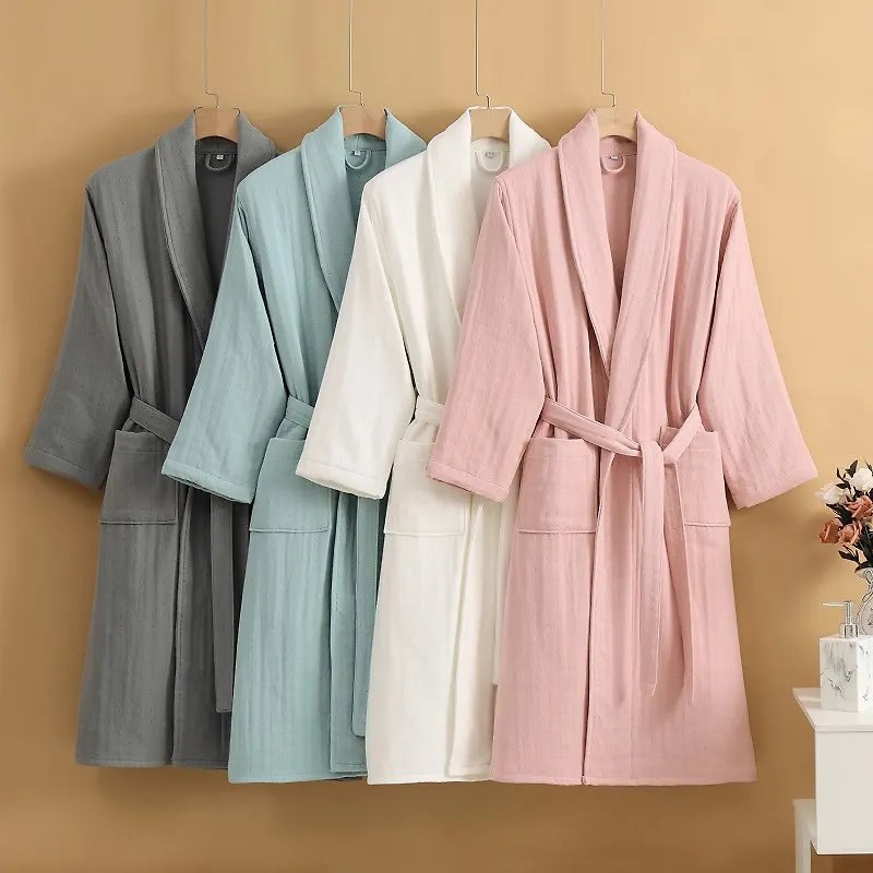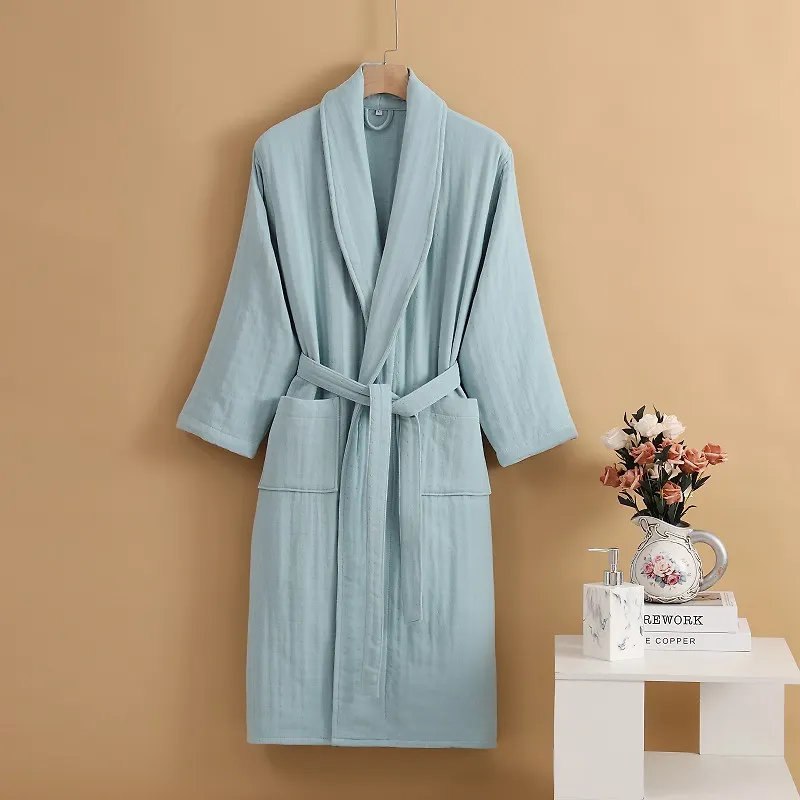 Плотный марлевый халат на запах с поясом и накладными карманами в японском стиле.