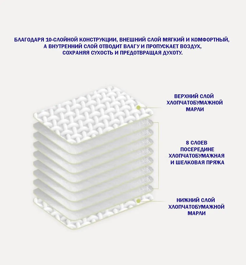 Материал: длинноволокнистый хлопок Surface Awati (поверхностный слой), ламинированное соевое волокно (сэндвич)