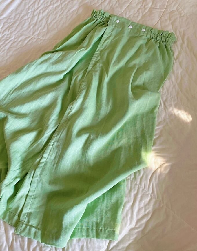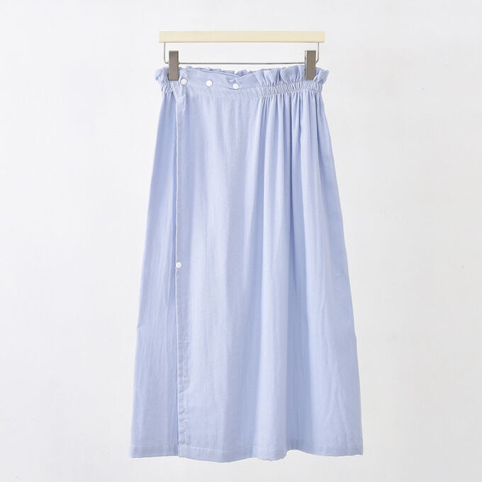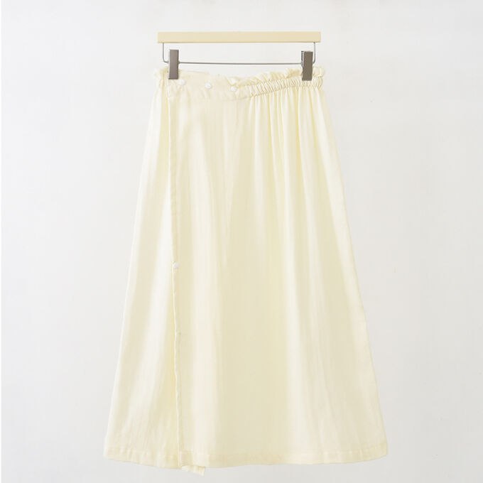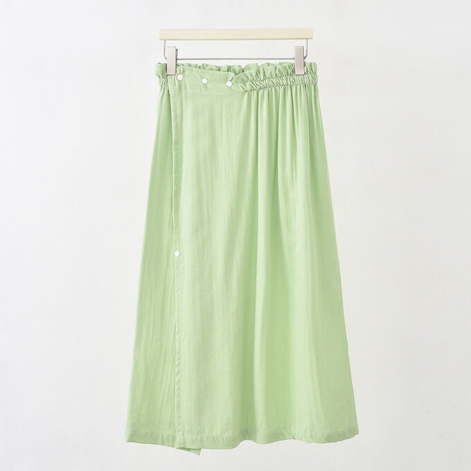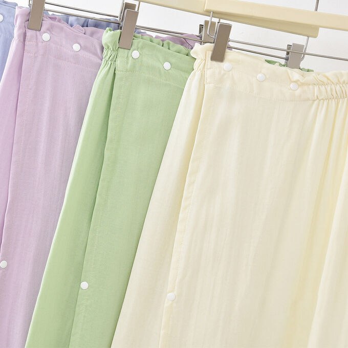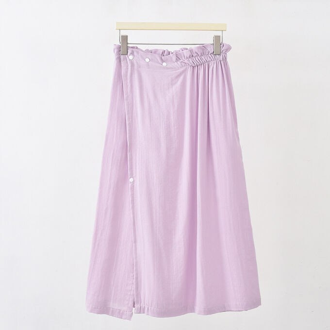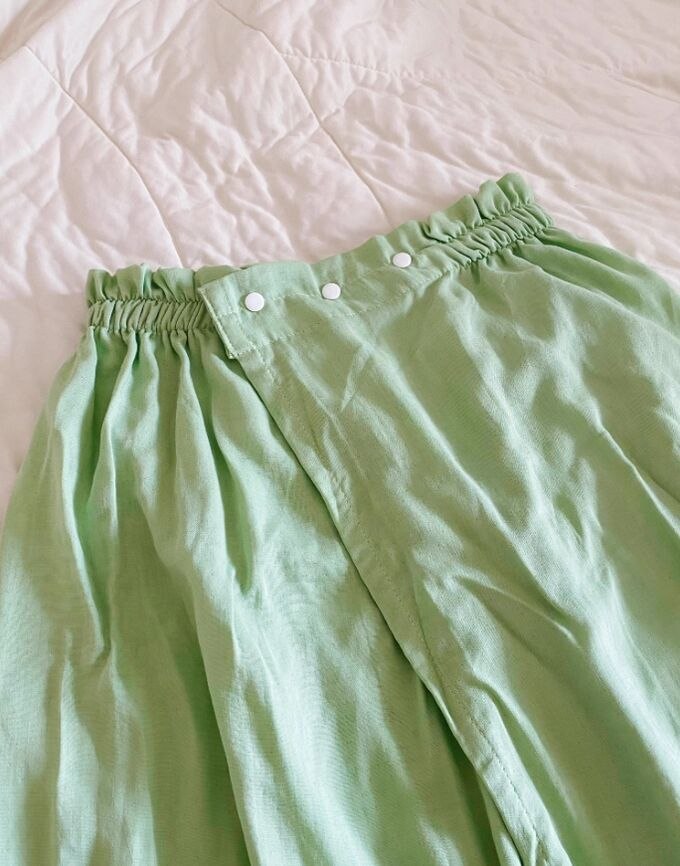 На кнопках, широкая резинка, регулируемый размер 42-52 (объем 70-120 см.), приятный к телу материал.