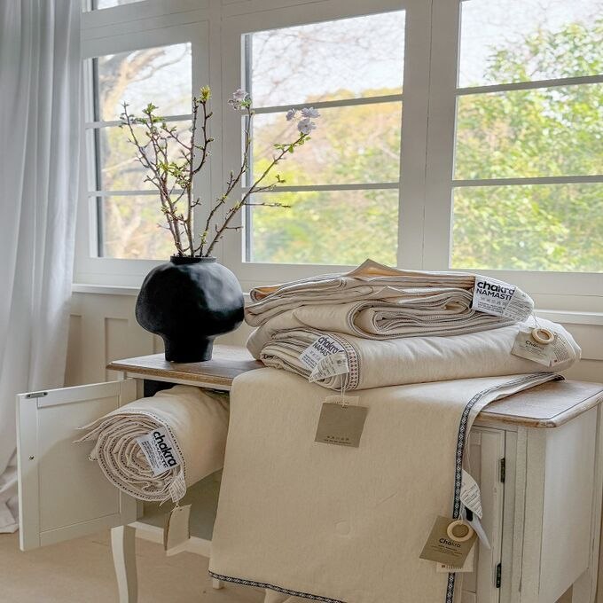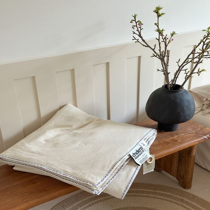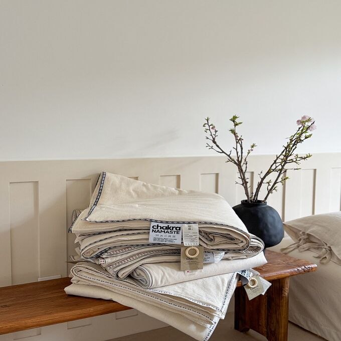 Одеяло жаккардового плетения из японского льна и хлопка-тенселя, с наполнителем из соевого волокна и минималистичными пуговицами из кокосовой скорлупы.