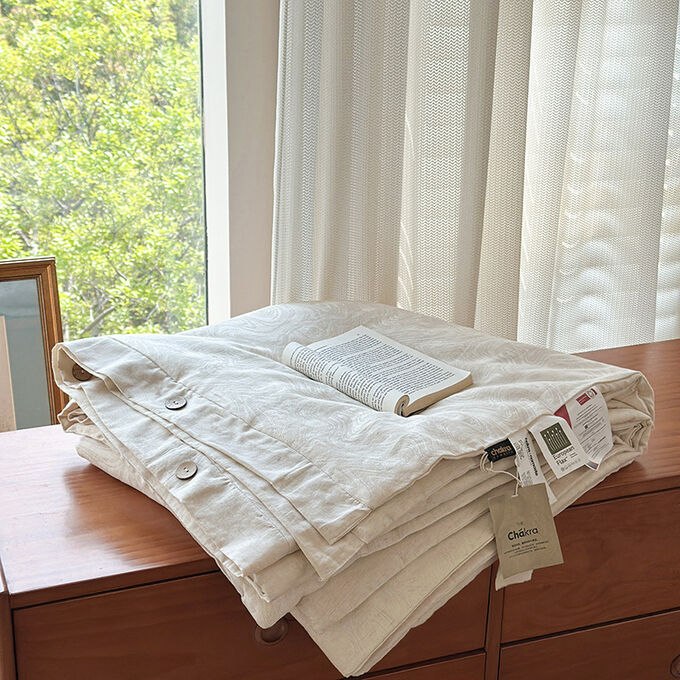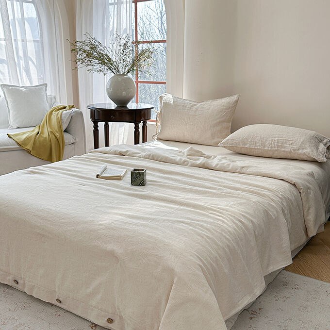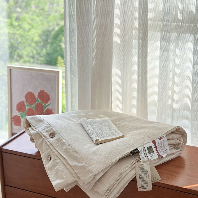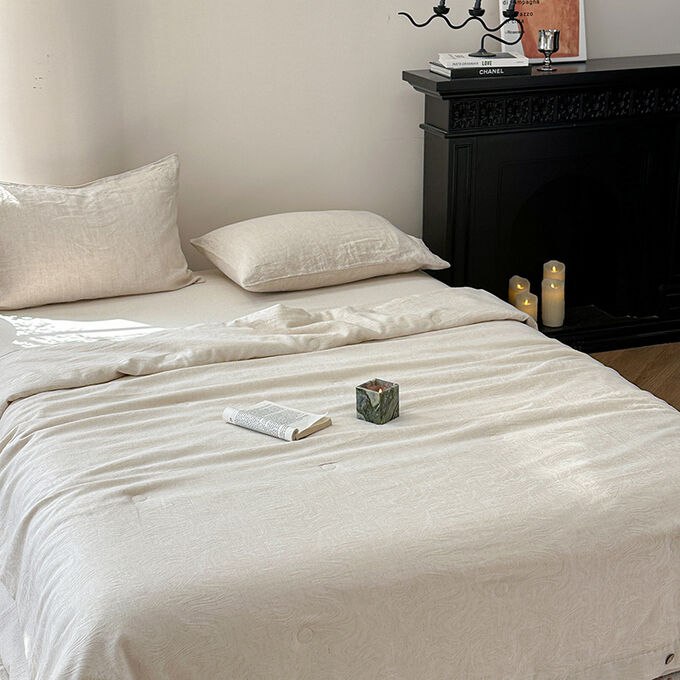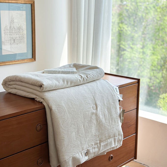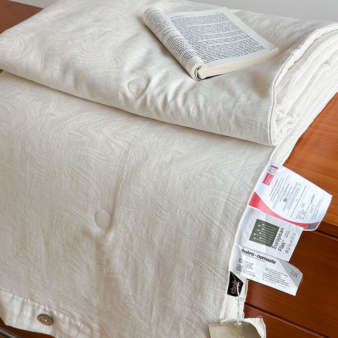 Одеяло жаккардового плетения из японского льна и хлопка-тенселя с пуговицами и наполнителем из соевого волокна.