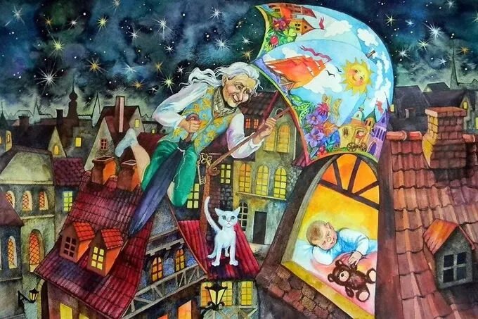 ...Вечером, когда дети смирно сидят за столом или на своих скамеечках, является Оле Лукойе. В одних чулках он подымается тихонько по лестнице, потом осторожно приотворит дверь, неслышно шагнет в комнату и слегка прыснет детям в глаза сладким молоком. Веки у детей начинают слипаться...