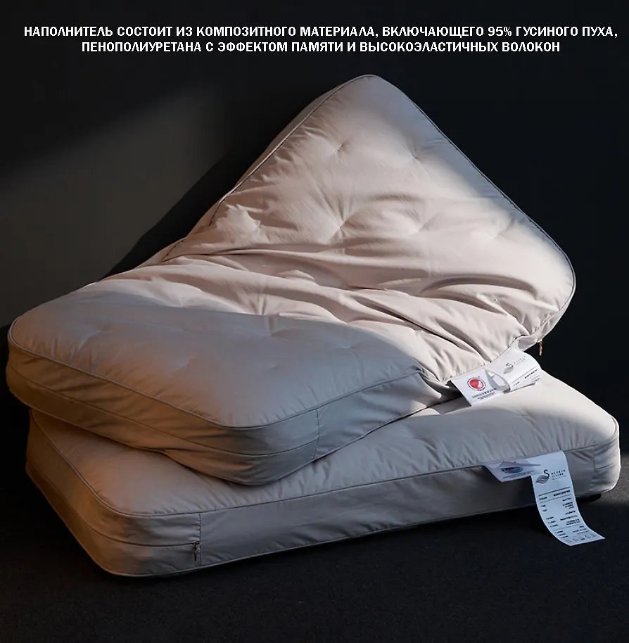 * наполнитель состоит из композитного материала, включающего 95% гусиного пуха, пенополиуретана с эффектом памяти и высокоэластичных волокон.