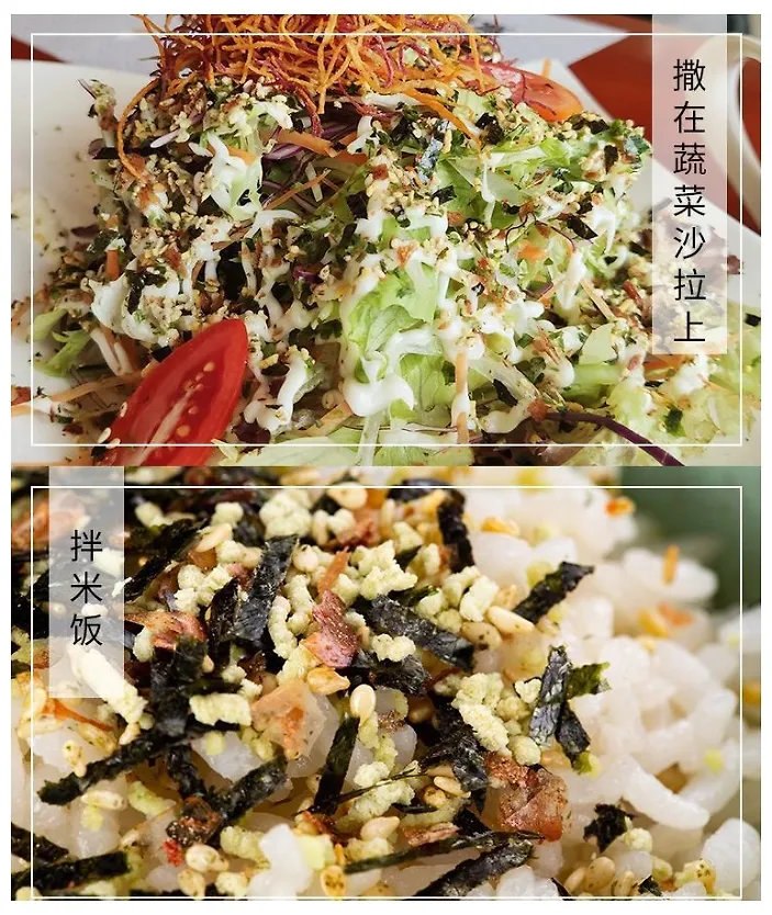 Посыпка идеально подходит для рисовых шариков, онигири, в качестве посыпки для блюд из отварного риса, лапши, рыбы, омлета, бутербродов, салата из зеленых листьев и шпината.