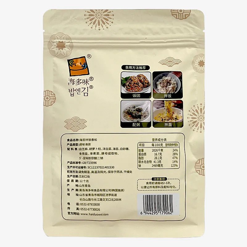 Ингредиенты: жареные семена белого кунжута, нарезанная кубиками морковь, капуста, морские водоросли, белый сахар, соль, бок-чой (пак-чо́й), дрожжевой экстракт, динатрий-5-инозинат.