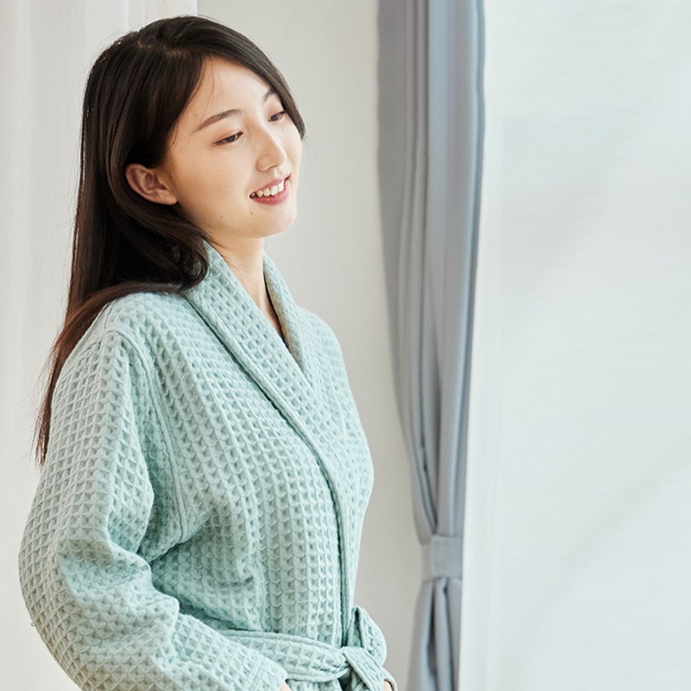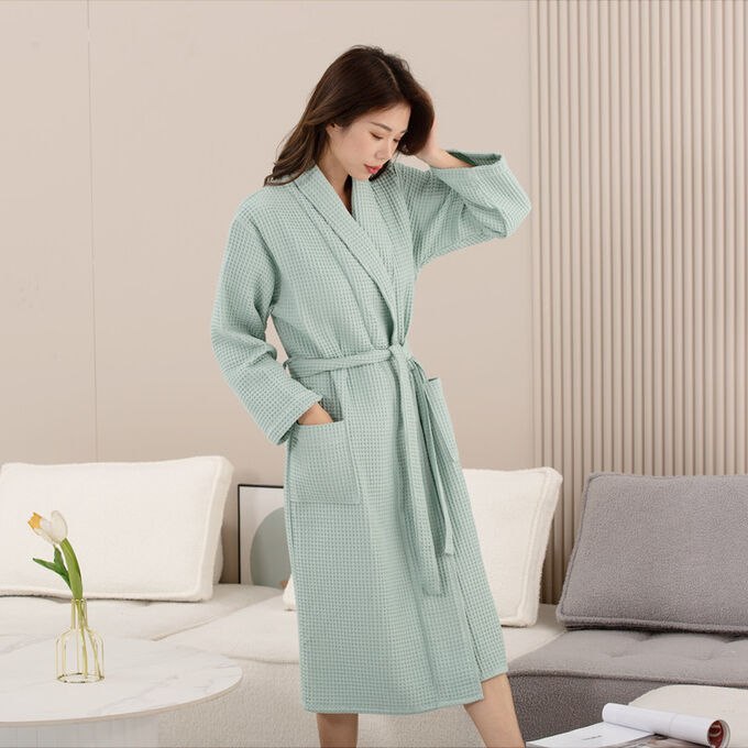 Плотный домашний вафельный халат на запах с поясом и накладными карманами в японском стиле.