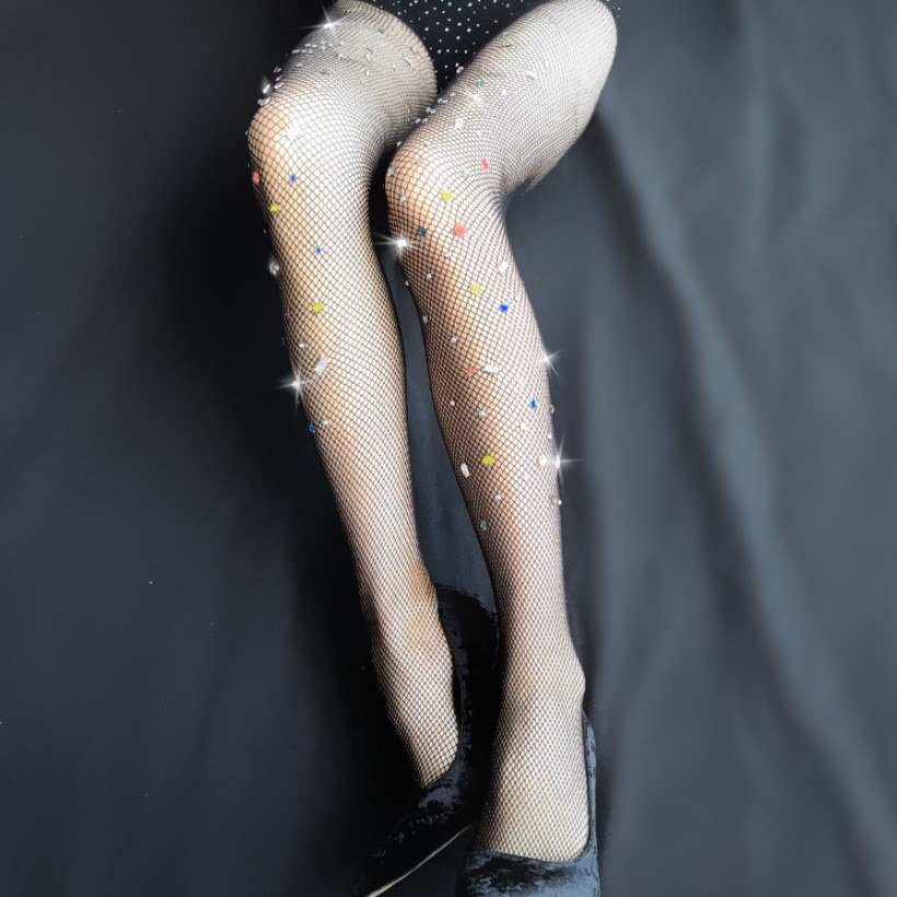 Колготки в среднюю сетку с крупными переливающимися стразами.